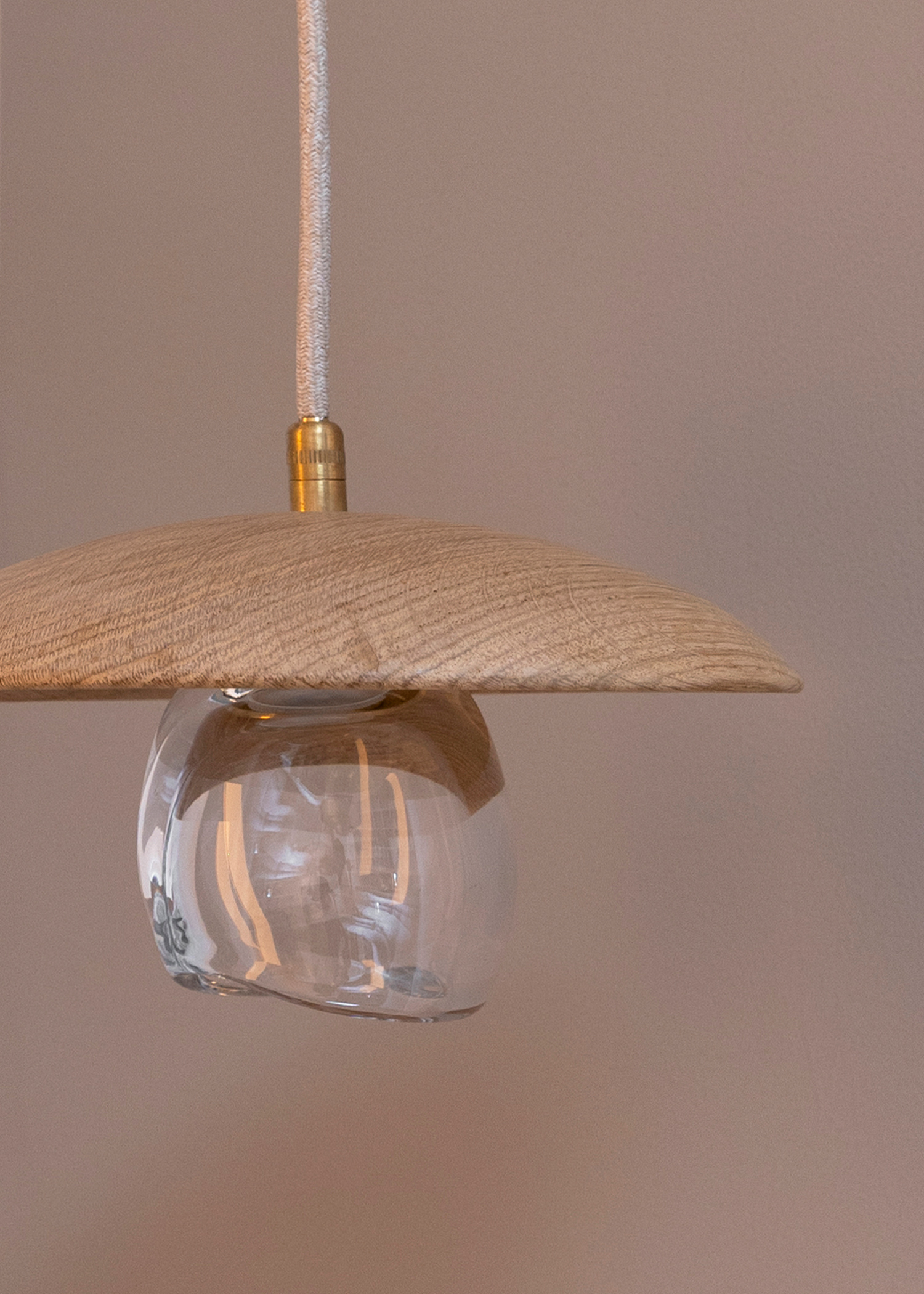 hand blown clear glass fitted under an LED pod, with a top shade in brass or oak